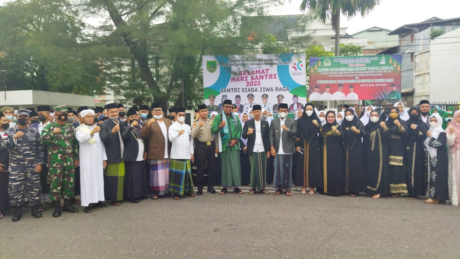 Rokan Hilir - Peringatan Hari Santri Nasional (HSN) di Kabupaten Rokan Hilir (Rohil) dipusatkan di ibu kota Bagansiapiapi. Upacara peringatan HSN yang bertemakan 'santri siaga jiwa raga' tersebut secara langsung di pimpin Bupati Rohil Afrizal Sintong SIP, Jumat (22/10/2021).