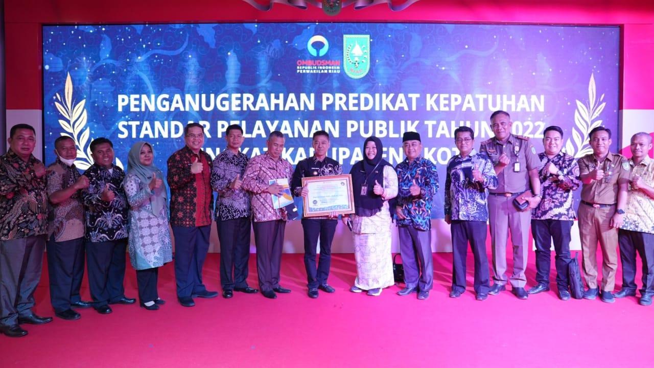 Dengan penilaian itu, Ombudsman RI menyerahkan Piagam penghargaan predikat kepatuhan standard pelayanan publik tahun 2022 yang diterima langsung oleh Bupati Rohil Afrizal Sintong, Selasa (28/2/2023) di Balai Serindit Pekanbaru.