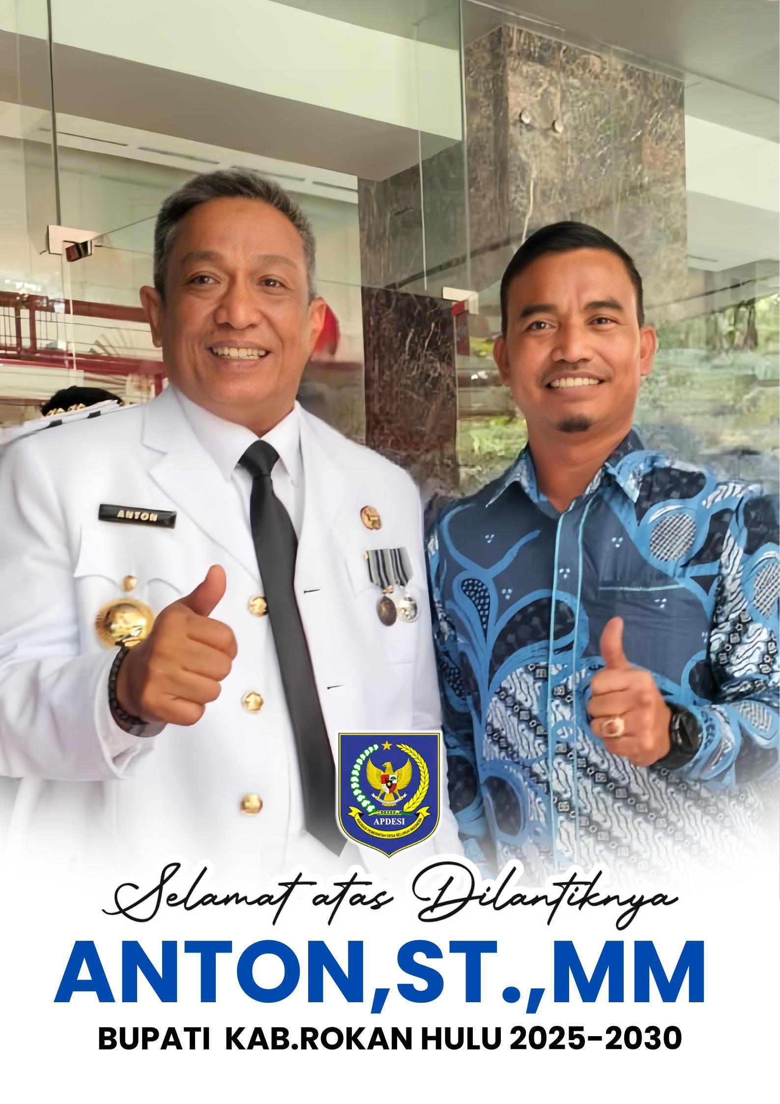 RIAUIDENTITAS.COM-JAKARTA-DPC Asosiasi pemerintah desa ( APDESI ) Kabupaten rokan hulu mengucapkan Selamat dan Sukses atas pelantikan Bupati dan Wakil Bupati rokan hulu Periode 2025-2030, Anton,ST.,MM dan H.Syafaruddin Poti,SH.,MM yang dilaksanakan pada hari ini 20 Februari 2025 di Istana Merdeka.