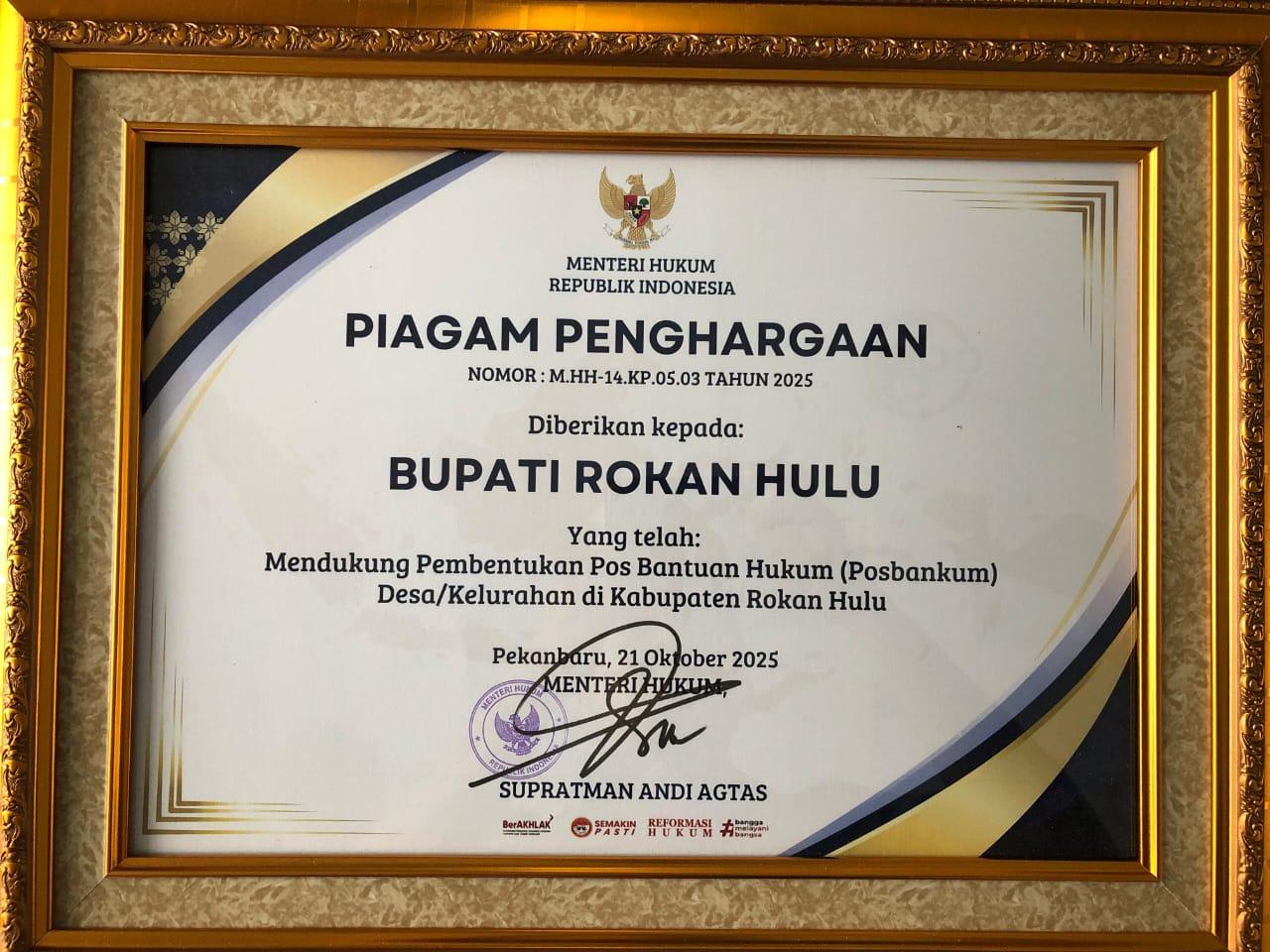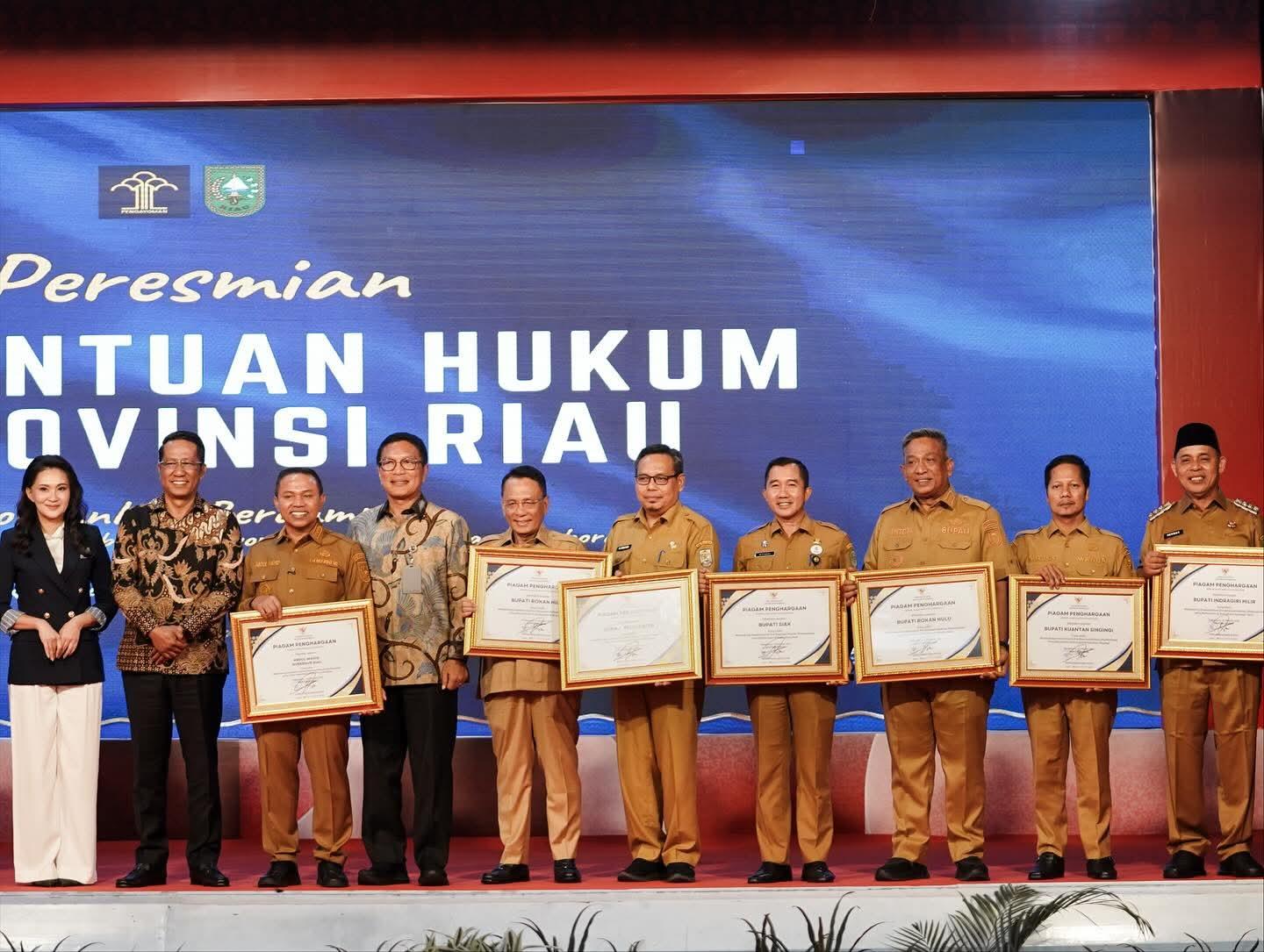 Penghargaan tersebut diserahkan secara resmi pada acara Peresmian Pos Bantuan Hukum dan Penandatanganan Perjanjian Kerjasama yang digelar di Aula Balai Serindit, Gubernuran Riau, dengan dihadiri jajaran pejabat dari Kementerian Hukum dan HAM Republik Indonesia serta berbagai unsur terkait, Selasa (21/10/2025).