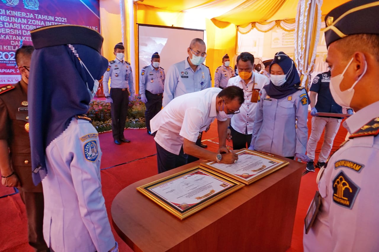 BAGANSIAPIAPI- Lembaga Pemasyarakatan (Lapas) Kelas II A Bagansiapiapi dan Kantor Imigrasi Kelas II TPI Bagansiapiapi laksanakan deklarasi janji kinerja 2021 dan pencanangan pembangunan zona integrasi menuju Wilayah Bebas dari Korupsi (WBK) dan Wilayah Birokasi Bersih dan Melayani (WBBM), Rabu (24/2/2021). Kegiatan tersebut dihadiri Kadiv Imigrasi Kemenkum HAM Riau Mujiono, Bupati Rohil H Suyatno AMp, Kalapas Bagansiapiapi Wachid Wibowo AmDip SSos MM, Kajari Rohil Gaos Wicaksono SH MH, Kepala BPN Rohil HM Rocky Soenoko SH MSi, Wakil ketua DPRD Rohil Hamzah SHI MM dan sejumlah pejabat tinggi pratama administrasi Rohil serta perwakilan dari instansi vertikal.