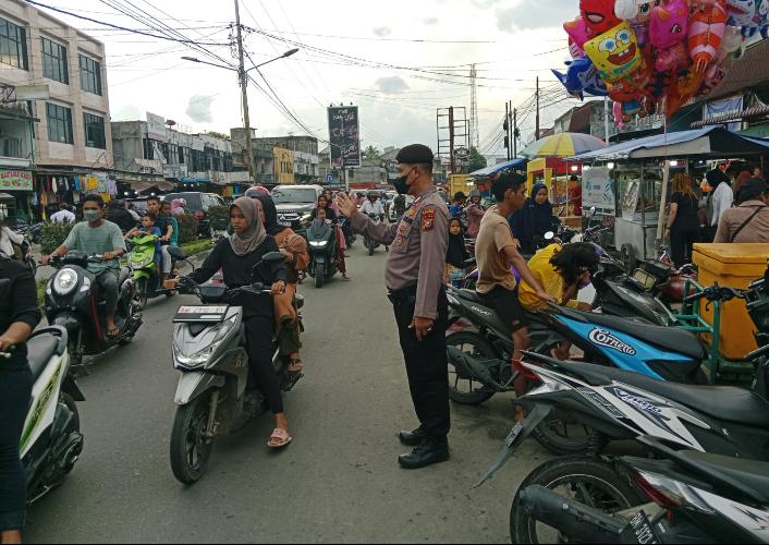 ROKAN HULU-(RI)-Operasi tertib Ramadhan (OTR) Lancang Kuning (LK) Tahun 2023, Personil Polsek Ujungbatu Polres Rokan Hulu (Rohul) melakukan pengamanan dan pengaturan Lalin di Pasar Ramadhan Jln. Jend Sudirman Kelurahan Ujung Batu, Jumat (24/32023)