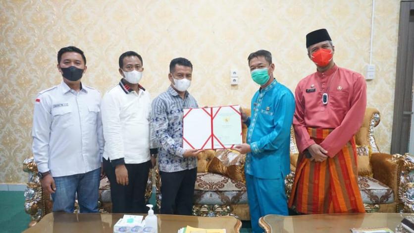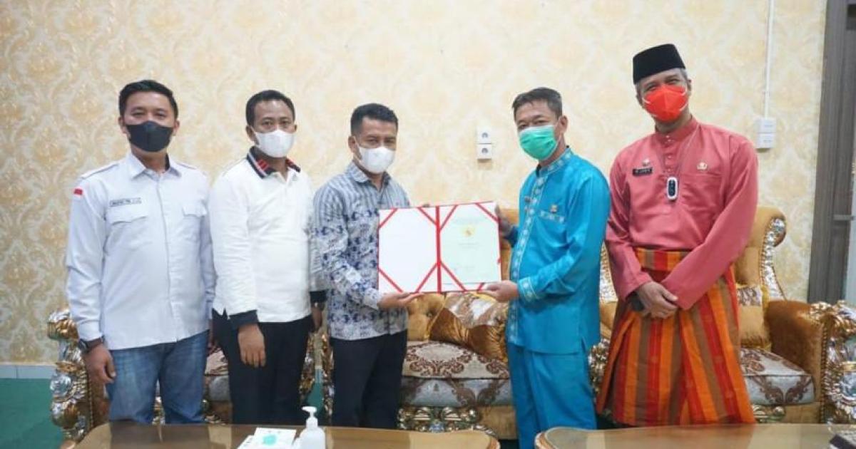Rokan Hilir - Bupati Rokan Hilir Afrizal Sintong didampingi Wakil Bupati H. Sulaiman menyerahkan sertifikat tanah kepada Badan Pengawas Pemilihan Umum (Bawaslu) Kabupaten Rohil, Rabu (4/8/2021) di Bagansiapiapi.