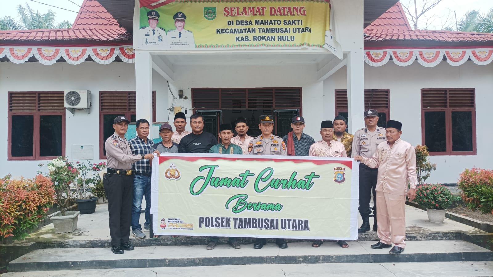 Kegiatan Curhat Jumat Polsek Tambusai Utara itu dilaksanakan di Aula Kantor Desa Mahato sakti itu, dihadiri Kapolsek Tambusai Utara AKP P. Simatupang, Sekdes Mahato Sakti Umar Gani, Kanit Binmas Aipda L. Manurung, Bhabinkamtibmas Aipda J. Samosir, para Kadus, Danton Linmas dan anggota serta para RT/RW desa setempat.