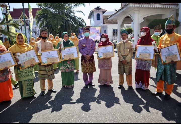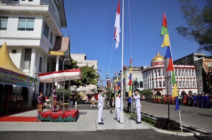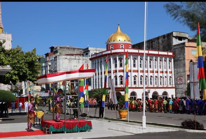 Bupati Rohil Afrizal Sintong secara langsung memimpin upacara peringatan HUT Rohil yang di pusatkan di depan kantor BPKAD, Jalan Merdeka, Bagansiapiapi, Senin (4/10/2021).