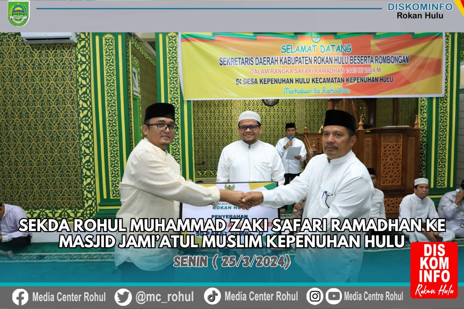 Sebagai pembuka acara Safari Ramadhan di Masjid Jami'atul Muslim, Sekda Rohul dan Perwakilan Pimpinan lainnya memberikan bantuan paket sembako dengan rincian dari Baznas untuk fakir miskin sebanyak 50 paket sembako, Kesra untuk anak yatim 10 juta untuk kaum dhuafa 5 juta dan Al-Quran 25 buah, Dinsos memberikan paket sembako untuk kaum dhuafa 30 paket sembako, Bank Riau Kepri cabang Rohul memberikan untuk kaum dhuafa 20 paket sembako, BRI cabang Pasir Pengaraian 10 paket sembako dan 10 paket sekolah.