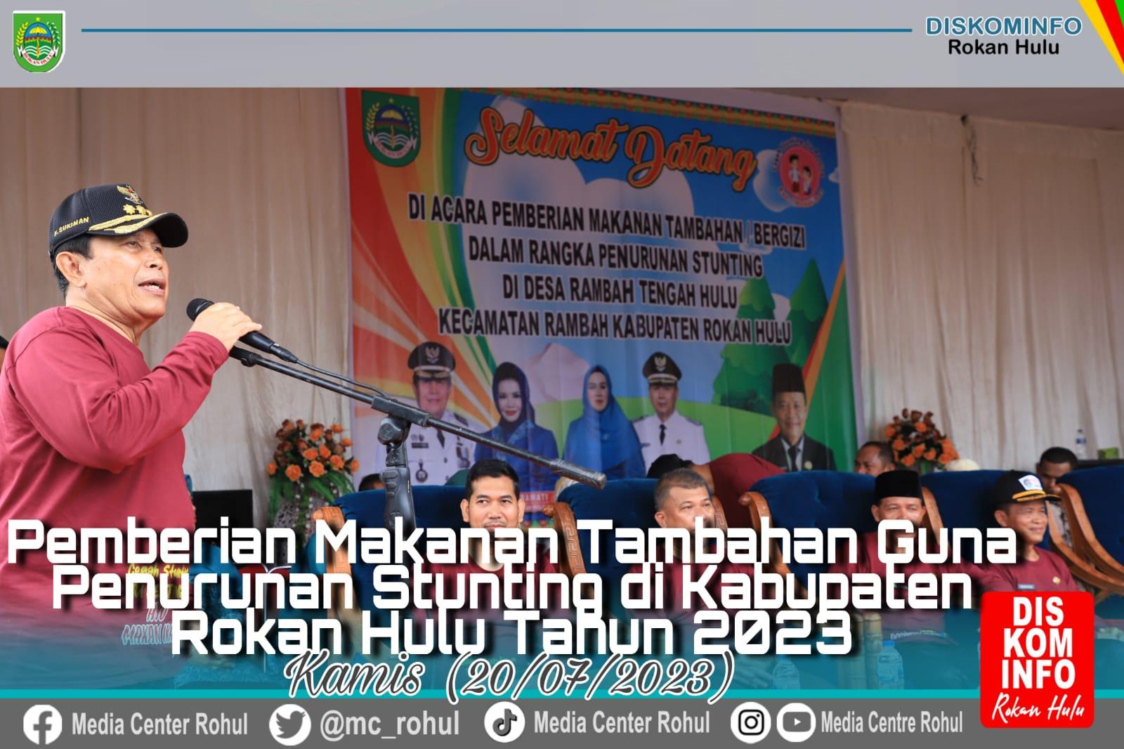 Harapan itu disampaikan Bupati Rohul H. Sukiman dan Ketua TP PKK Rohul Hj. Peni Herawati Sukiman saat Memberikan Makanan Tambahan Bergizi dalam rangka penurunan Stunting, di Desa Rambah Tengah Hulu, Kecamatan Rambah, Kamis (20/7/2023).