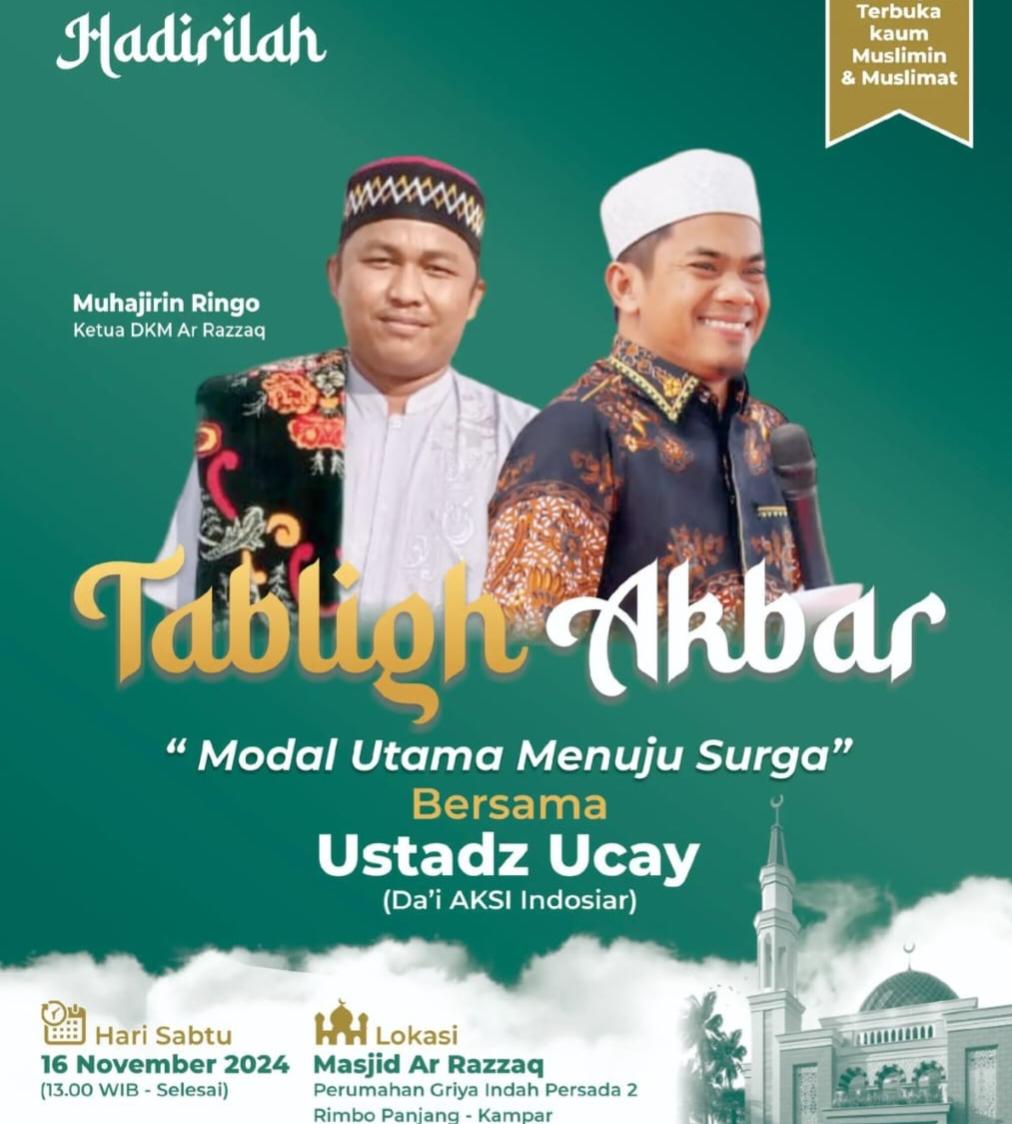 RIAUIDENTITAS.COM-KAMPAR-Masjid Ar Razzaq yang beralamat di jalan akasia perumahan Griya Indah Persada 2 Rimbo Panjang kampar akan menggelar Tabligh Akbar bersama Ustadz Ucay pada tanggal 16 November 2024 dengan tema "modal utama menuju surga"