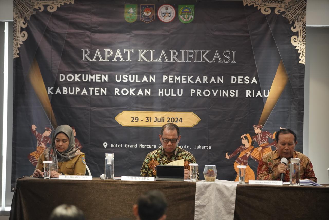 Rapat Klarifikasi Dokumen Usulan Pemekaran Desa di Kabupaten Rokan Hulu itu dibuka langsung Dirjen Bina Pemerintahan Desa Kemendagri Dr.Drs.La Ode Ahmad P. Bolombo., AP., M.Si di Hotel Mercure Gatsu Jakarta selama 3 hari mulai Senin hingga Rabu (29-31/7/2024).