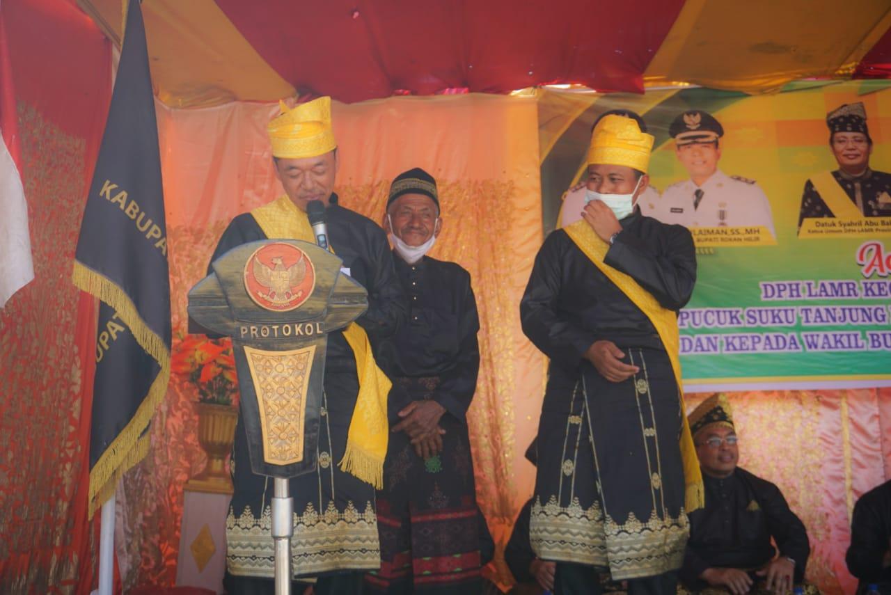 Rokan Hilir - Lembaga Adat Melayu (LAM) Riau memberikan gelar Datuk Setia Adat kepada Bupati Rokan Hilir (Rohil) Afrizal Sintong, Sabtu (9/10/2021) sore di Danau Napangga Kecamatan Tanjung Medan. Wakil Bupati Rohil H Sulaiman diberikan gelar Datuk Timbalan Setia Adat.
