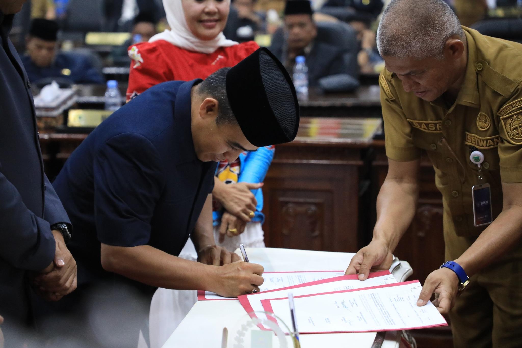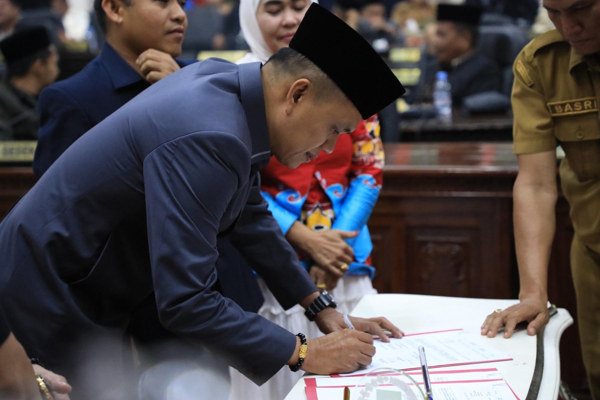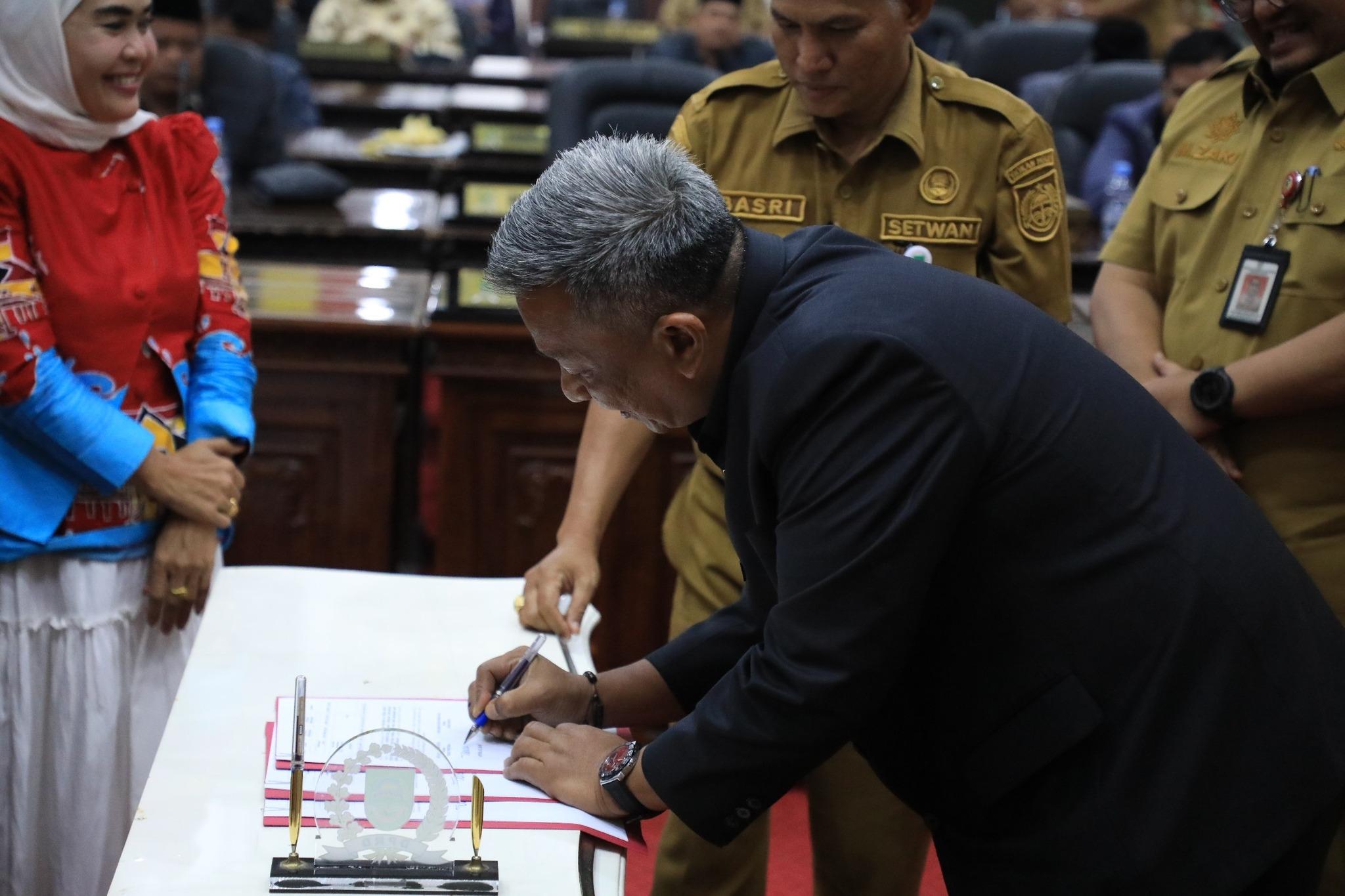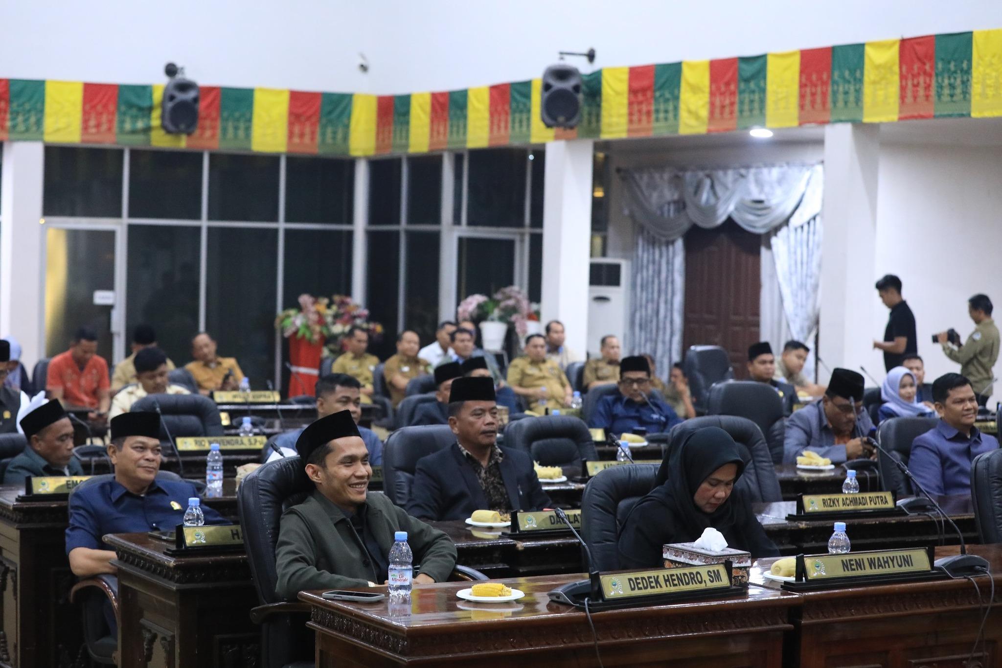 Juru Bicara Banggar, Ayatullah Kumaini SE MSi, menyampaikan laporan hasil pembahasan di hadapan seluruh peserta paripurna. Setelah itu, Ketua DPRD secara resmi meminta persetujuan forum, yang secara bulat menyatakan setuju, lalu dilanjutkan dengan ketukan palu pengesahan.