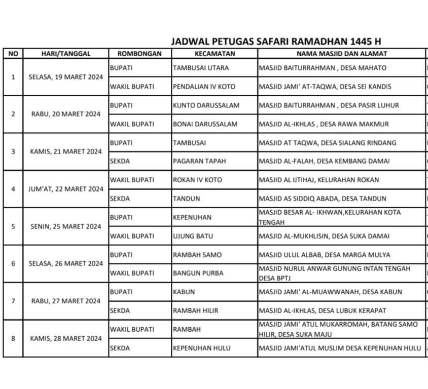 Berikut ini merupakan jadwal lengkap Safari Ramadhan 1445 Hijriah Pemkab Rohul, dalam satu pekan ke depan.