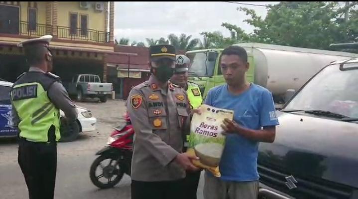 Sebanyak 10 kantong beras masing-masing seberat 5 Kilogram itu dibagikan Kapolsek Ujung Batu AKP Andi Cakra kepada para sopir yang melintas di jalan raya.