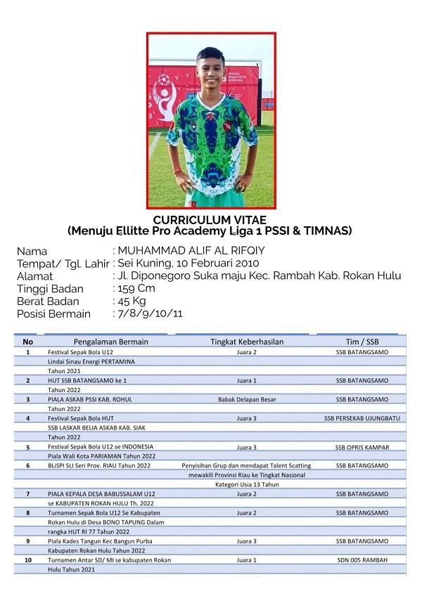 Berawal dari Sekolah Sepak Bola (SSB) Batang Samo Desa Sukamaju Kec Rambah, M Alif Sudah malang melintang mengukir prestasi sebagai pemain andalan dengan posisi bermain 7,8,9,10 dan 12. (Lihat Curiculum Vitae)