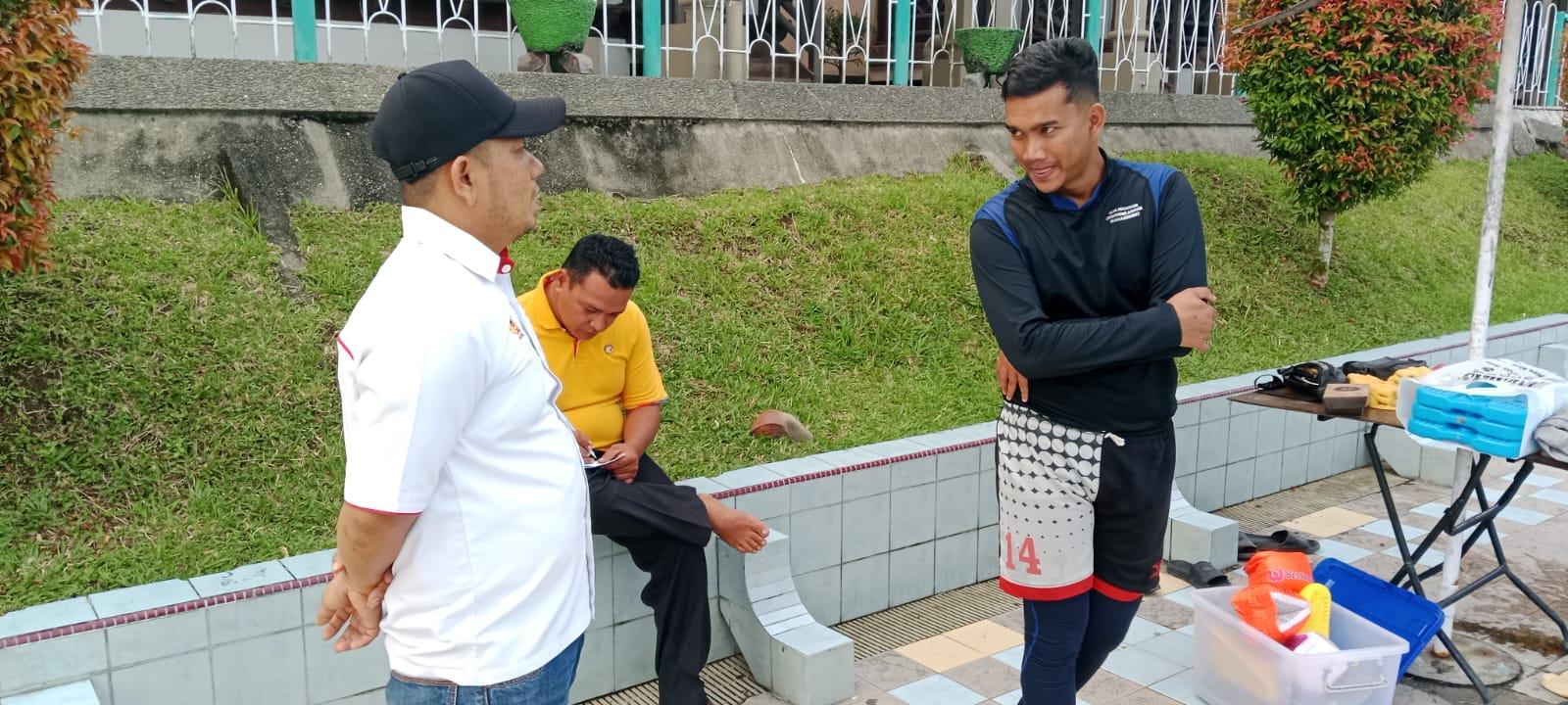 Pada kesempatan itu, Wakil Sekretaris I KONI Rohul Ramses Hutagaol berdiskusi dengan Sabam Surya mengenai peralatan latihan yang sudah mulai tidak layak digunakan.