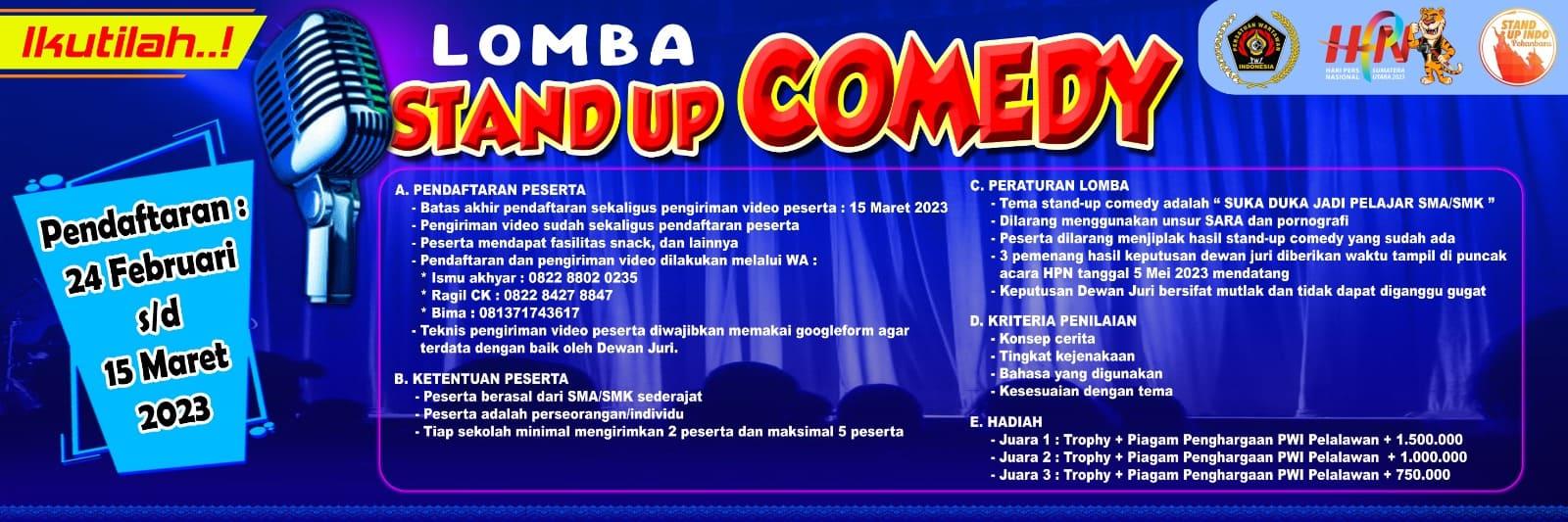 PELALAWAN-(RI)-Rangkaian kegiatan Hari Pers Nasional (HPN) dan HUT PWI ke 77 tahun 2023 tingkat Kabupaten Pelalawan, selain pertandingan internal akan dilombakan juga lomba eksternal yakni Stand-up Comedy yang merangkul siswa SMA/SMK/MA sederajat se Kabupaten Pelalawan.