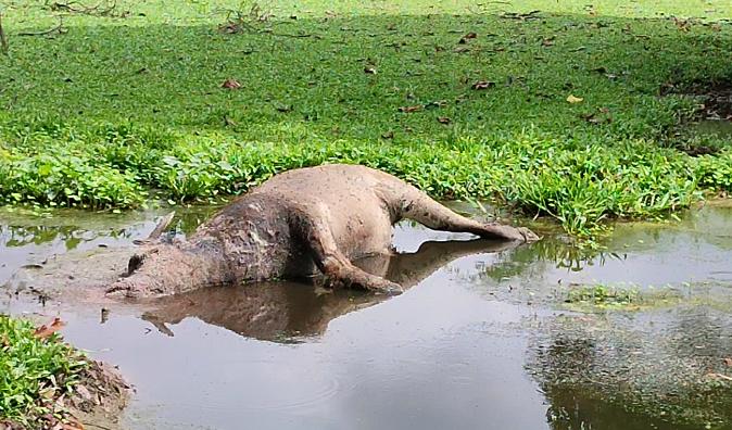 Tampak, petugas dari Babinsa Koramil 02 Rambah Kodim 0313/KPR memantau kerbau mati yang berada di Desa Bangun Purba Timur Jaya, Rohul.