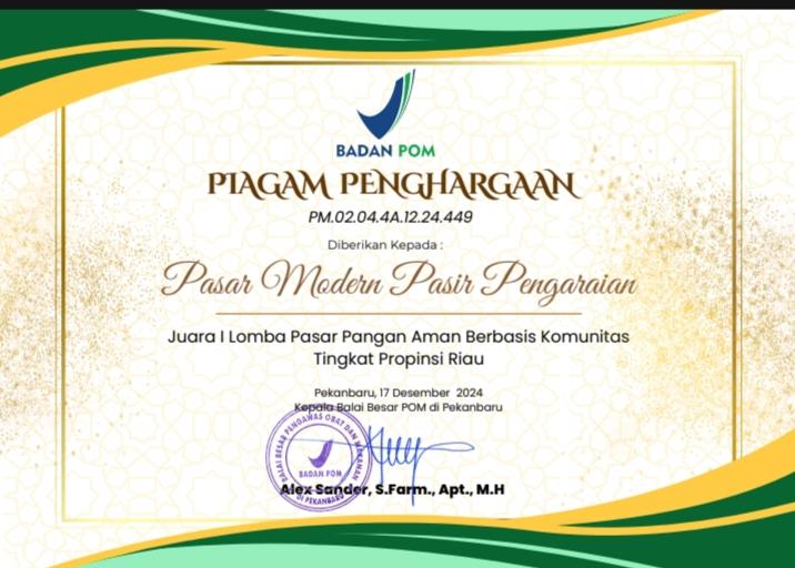 Piagam penghargaan juara I lomba Pasar Pangan Berbasis Komunitas itu ditandatangani oleh Kepala Balai Besar POM Pekanbaru, Alex Sander, S. Farm., Apt., MH.