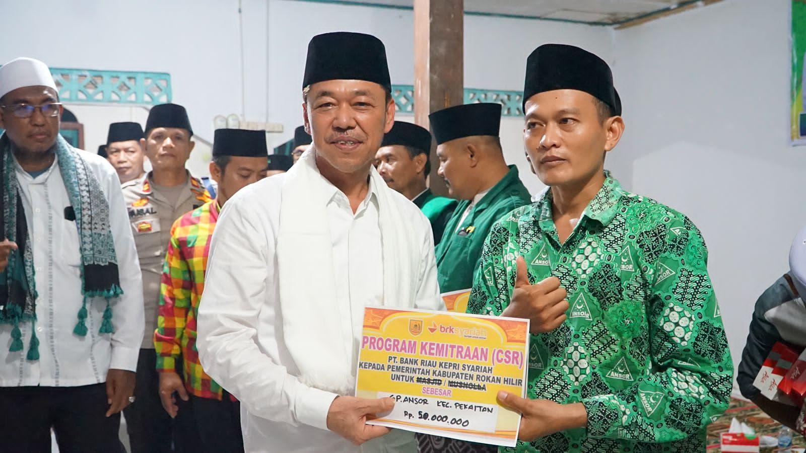 Usai sholat Isya dan tarawih berjamaah, Bupati menyerahkan bantuan dana pembangunan mesjid yang di terima langsung oleh pengurus Mesjid As-Shofa. Selain itu juga Pemkab Rohil menyerahkan bantuan program CSR Bank Riau Kepri serta bantuan dana untuk beberapa group rebana di Pekaitan.
