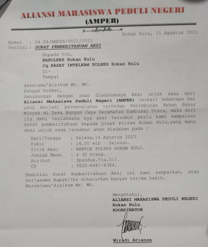 Terkait aksi damai AMPER ini diketahui dari adanya Surat Pemberitahuan aksi dengan nomor 04.04/AMPER/VIII/2023 yang sudah dilayangkan ke Kapolres Rohul di bagian Sat Intelkam Polres Rohul.