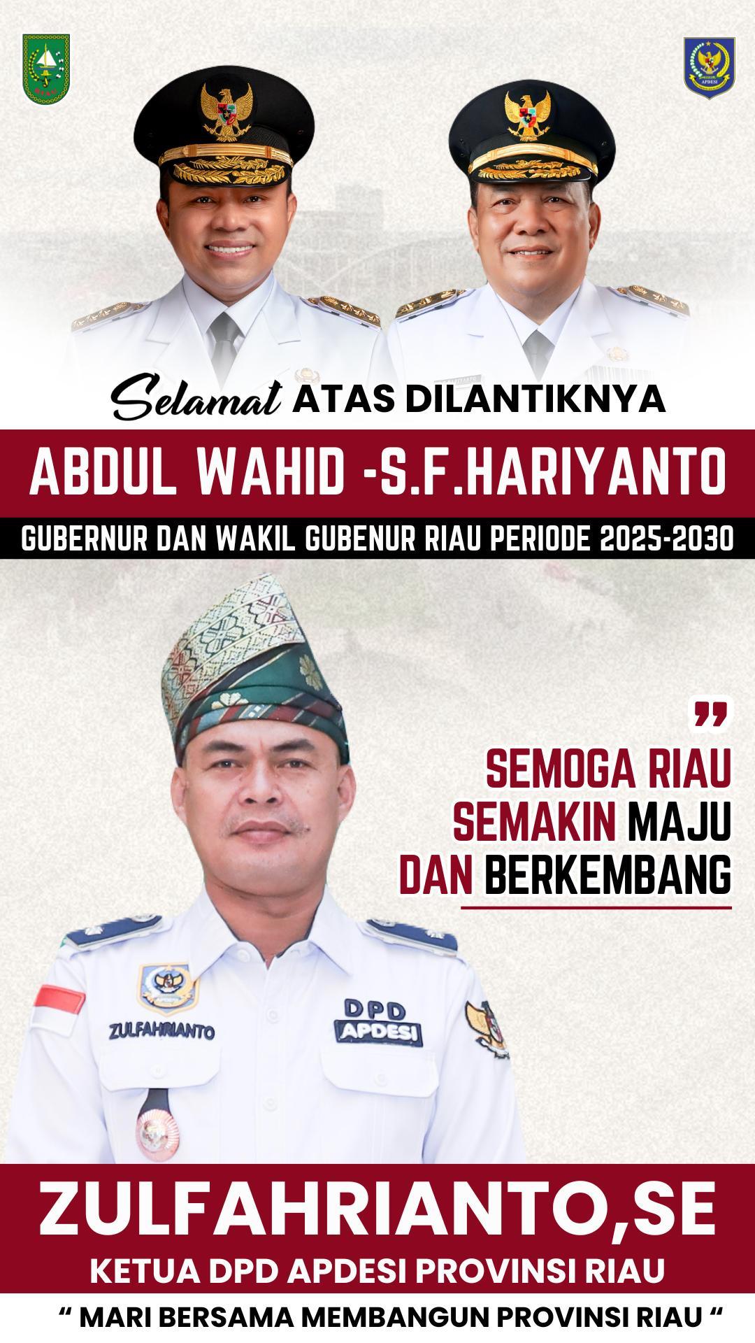 RIAUIDENTITAS.COM-JAKARTA-Zulfahrianto, SE Ketua DPD Apdesi Provinsi Riau mengucapkan selamat atas dilantiknya Gubernur dan Wakil Gubernur Provinsi Riau yang dilantik Hari Ini di halaman tengah Istana Kepresidenan Jakarta, Kamis (20/2/2025).
